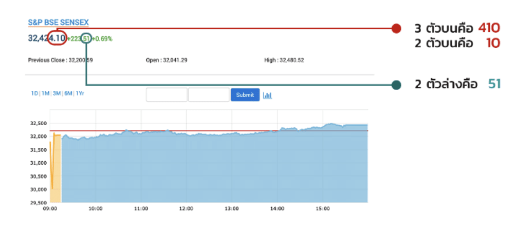 หวยหุ้นอินเดียมักใช้ผลการปิดตลาดของดัชนีหุ้น S&P BSE SENSEX ในการออกผลรางวัล และจะใช้เลขในหลักหน่วยและจุดทศนิยมของค่าปัจจุบัน Current ในการออกผลรางวัลสามตัวบน และใช้จุดทศนิยมของค่า Pt.Change ในการออกผลรางวัลสองตัวล่าง
