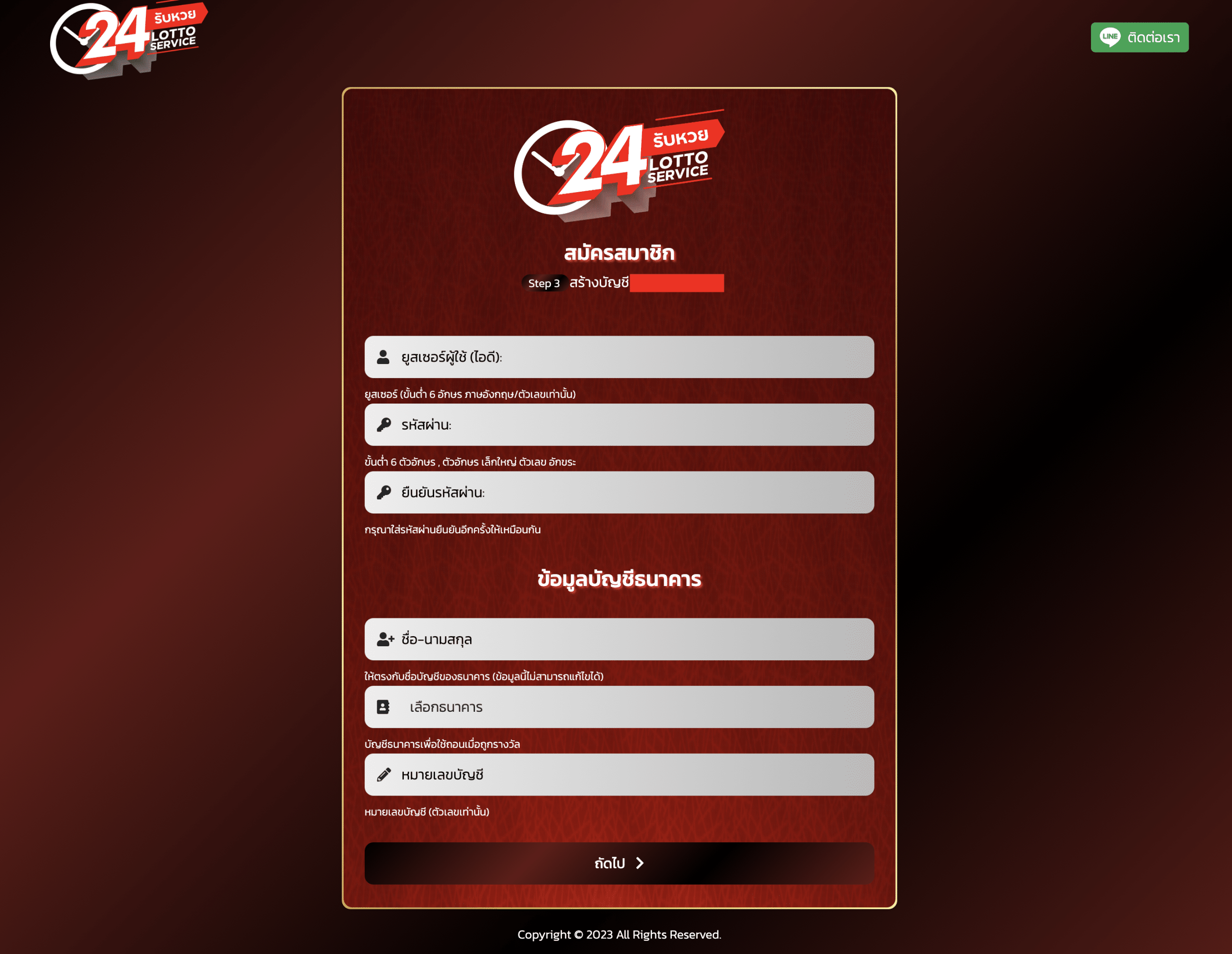 กรอกยูส และรหัสผ่านที่ต้องการ และกรอกข้อมูลธนาคารลงไป เพื่อใช้ในการฝากและถอนเงิน