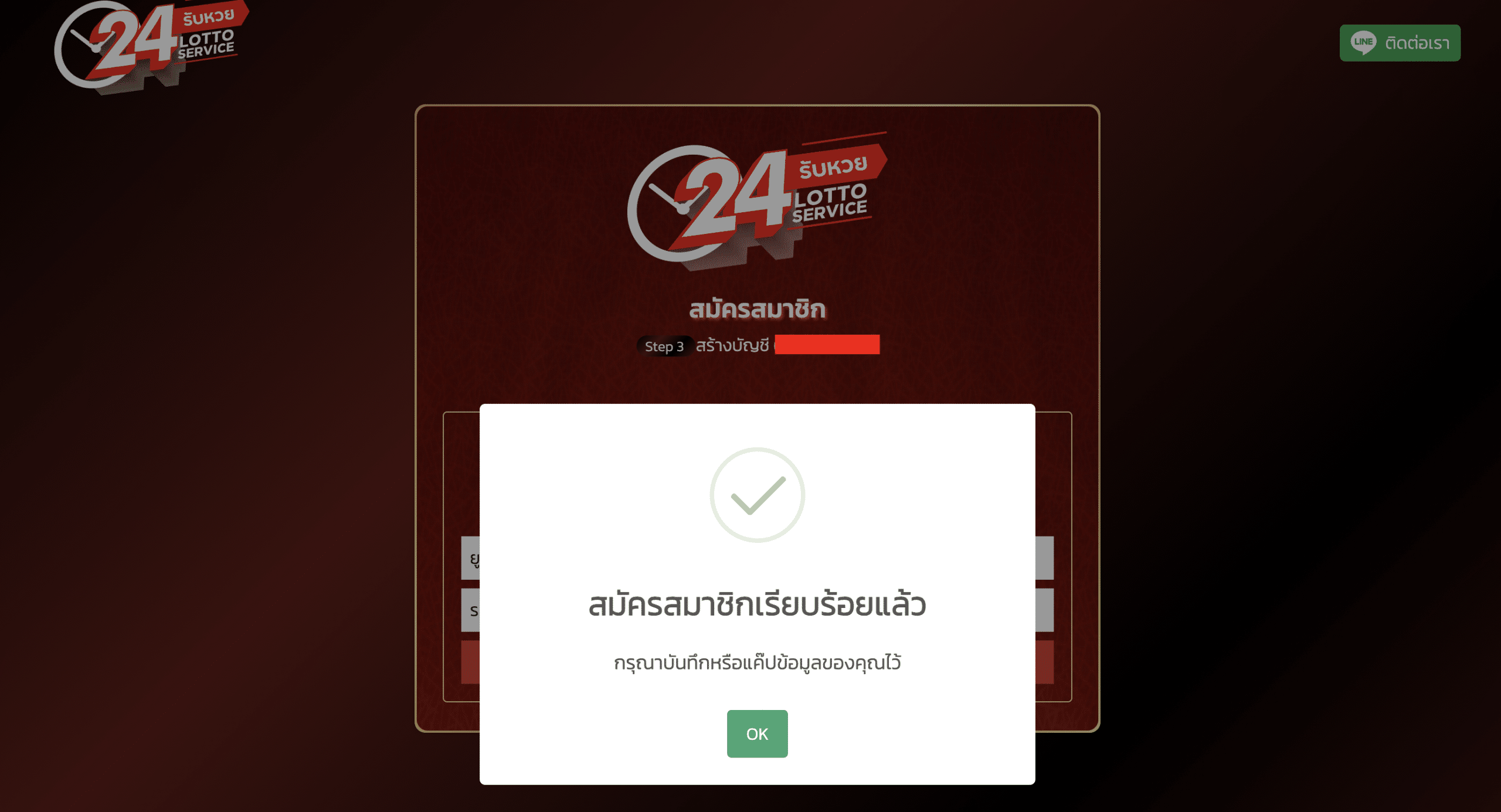 การสมัครเป็นอันเสร็จสิ้น กดปุ่ม OK แล้วพร้อมเข้าเล่นที่หน้าแทงหวยได้เลย